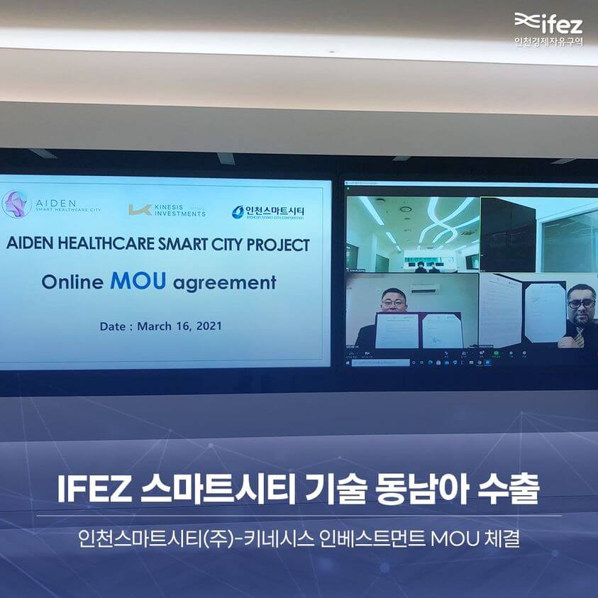 인천경제자유구역청은 인천시에서 전액 출자한 인천스마트시티(주)가 지난달 캐나다에 본사를 둔 글로벌 도시개발투자회사인 키네시스 인베스트먼트(KINESIS INVESTMENT)와 ‘에이든 스마트 헬스케어 시티 프로젝트(AIDEN SMART HEALTHCARE CITY PROJECT) 업무협약(MoU)’을 체결했다고 12일 밝혔다.