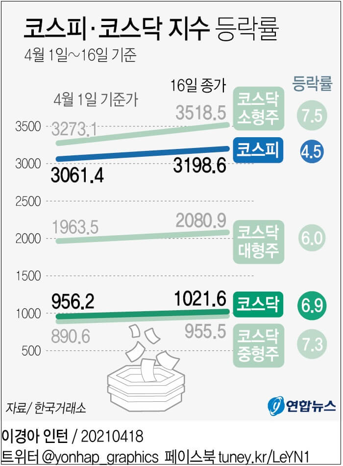 같은 기간 코스피는 3,061.42에서 3,198.92로 4.48% 올라 상승률이 코스닥 지수보다 낮았다