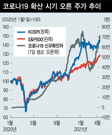 물론 집단 면역이 형성되면서 현재 나타나고 있는 제품 소비는 줄어들 것이고, 특정 산업의 수혜 바람도 한풀 꺾일 것이다. 또한 집단 면역으로 경제 정상화가 진행되면 지난 2~3월에 나타났던 것 같은 금리 상승과 정책 정상화 가능성이 증시에 충격을 줄 수 있다. 하지만 아직은 그런 시기로 보이지 않는다. 수십만명의 확진자가 발생하는 가운데 나타나는 주가 상승이 어색하게 느껴질 수 있지만, 아직 투자를 중단할 시점은 아니라고 생각된다.