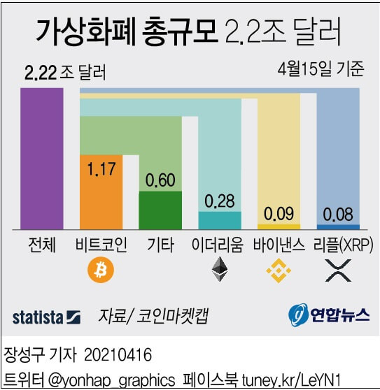 코인마켓캡에 따르면 15일 현재 가상화폐 시장규모는 2조2천2백억 달러에 이르는 것으로 나타났다
