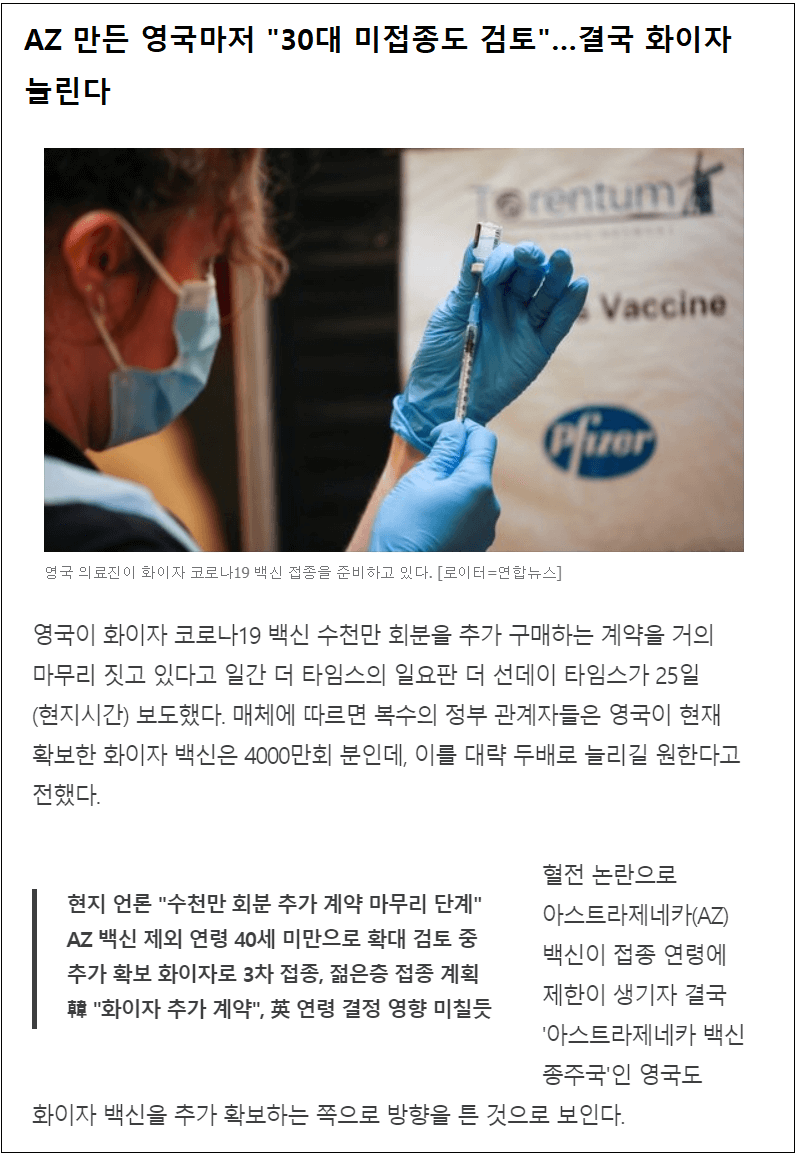 영국, AZ백신 포기?...화이자로 간다 UK officials close to deal to buy tens of millions more doses of Pfizer vaccine - Sunday Times