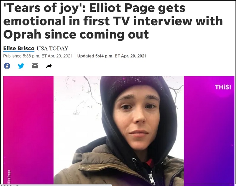 지난해 12월 한 SNS 게시물에 트랜스젠더로 나온 엘리엇 페이지는 오프라 윈프리와의 새로운 인터뷰를 했다.