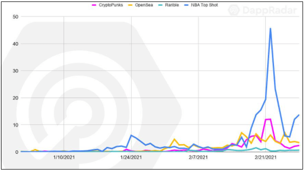 NFT 거래량(미국 달러 기준) 역시 2019년 6286만 달러에서 2020년 2억5085만 달러로 약 300% 증가했고, 이와 함께 NFT의 이전(판매), 보유 등에 쓰이는 디지털 지갑도 지난해 기준 전년대비 두 배 늘어난 22만2179개로 집계됐다. 2021년 1분기 성장세는 2020년보다 더 무섭다. 암호화폐 전문매체 댑레이더 집계에 따르면 지난 2월에만 상위 3개의 NFT 마켓 플레이스인 NBA Top Shot, OpenSea, CryptoPunks에서 NFT 거래량이 3억4200만 달러에 이르렀다.