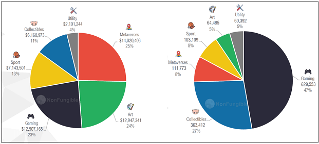 NFT가 주로 거래되고 있는 분야를 분석하면 NFT 산업이 취하고 있는 방향을 알 수 있다. 2020년을 기준으로 NFT 시장의 기초가 되는 주요 트렌드 분야는 예술, 수집품, 메타버스, 스포츠, 게임 및 유틸리티 등이며 판매 규모를 기준으로 한 시장 분포와 거래 건수를 기준으로 한 시장 분포는 아래와 같다.