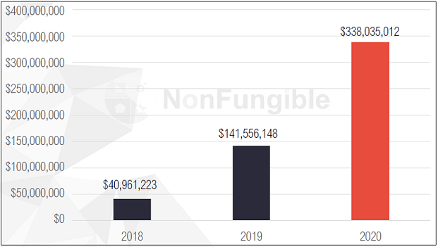 NFT 전문 분석 사이트인 NonFungible.com과 BNP파리바 라틀리에 연구소가 공동으로 발행한 보고서에 따르면, NFT 시장에 존재하는 자산의 총가치(시가 총액)는 2018년 4096만 달러, 2019년 1억4155만 달러, 2020년 3억3803만 달러로 폭등하고 있다.
