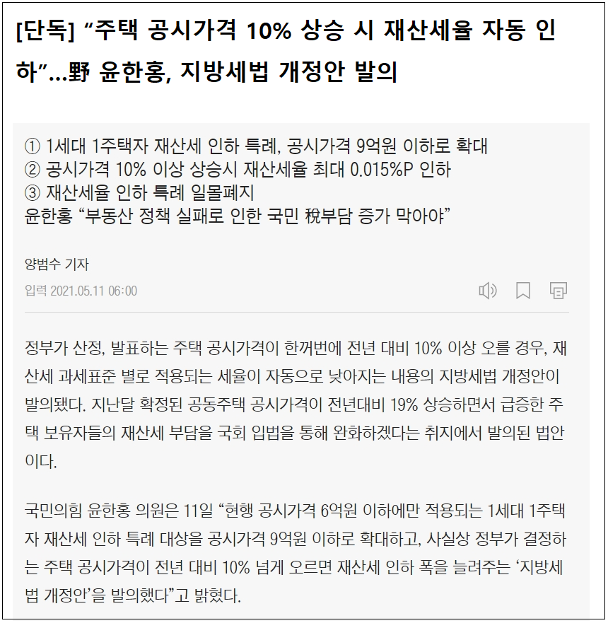“주택 공시가격 10% 상승 시 재산세율 자동 인하” 지방세법 개정 발의