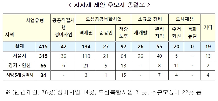또한, 사업계획(안)과 사업효과 등에 대한 주민설명회 등을 거쳐, 토지등소유자 10% 동의요건을 우선 확보하는 후보지에 대해서는 금년 하반기 예정지구로 지정하여 신속하게 개발할 예정이다.