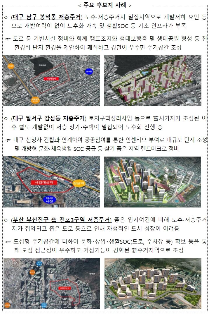 이번에 선정된 후보지들은 저층주거지 사업의 경우 20년 이상 노후건축물 비율이 대구는 50% 이상, 부산은 60% 이상인 지역을 대상으로 하였고, 추후 역세권 사업의 경우에도 대구는 역 반경 500m, 부산은 역 반경 350m 이내에 포함된 지역을 대상으로 하는 등 입지요건은 지역특성을 고려하여 차등적으로 운영할 예정이다.