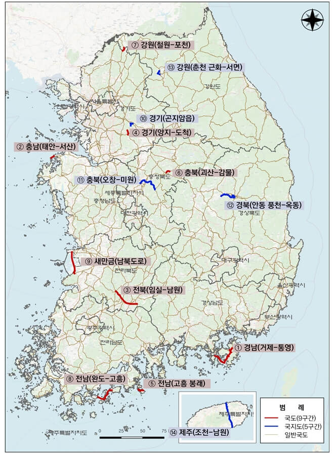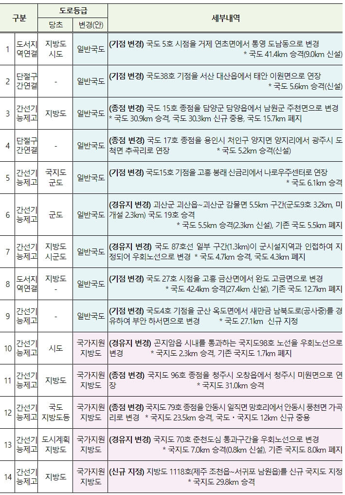 정부가 주요 거점을 연결하는 지자체 도로의 등급을 일반국도 및 국가지원지방도로 승격하고 체계적으로 관리한다. 이를 통해 도로 단절구간이 연결되고, 도서지역에 대한 교통기본권이 제공되는 등 국민의 교통 편의가 높아질 전망이다.