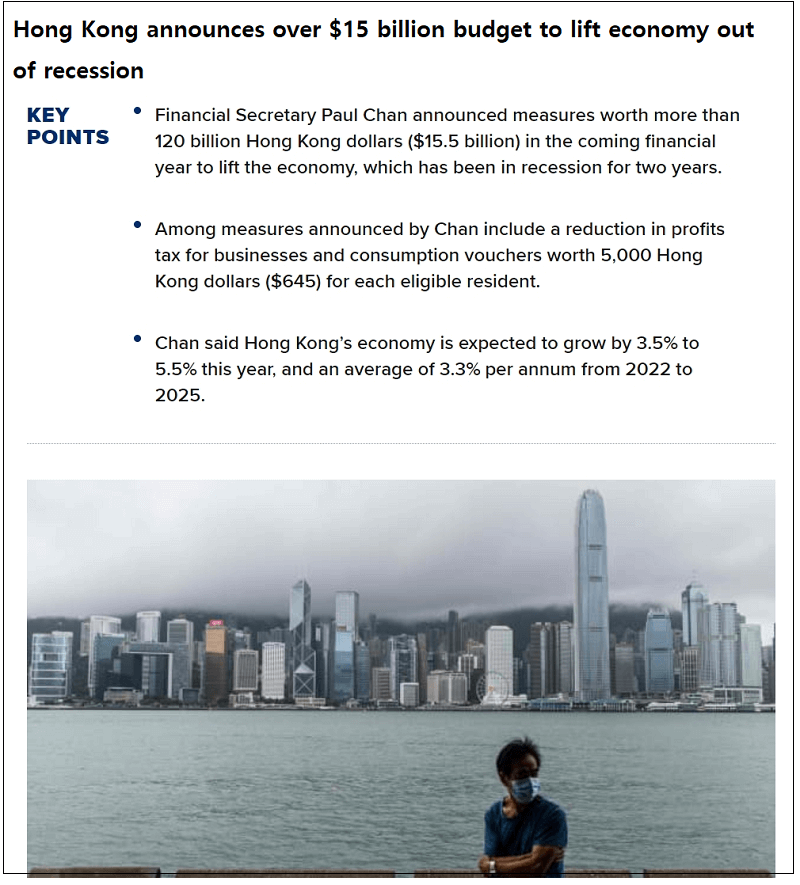 한편, 재정부는 2021~2022년 회계연도 기간의 정부 예산안은 전년 대비 16.9% 감소한 1,200억 홍콩달러(약 155억불)라고 밝혔다.