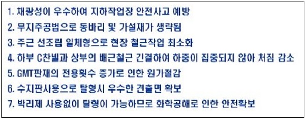 플러스데크의 특징으로는 시공성 측면에서 현장작업 최소화로 관리가 수월하다. 또 하부TG형 공법으로 동바리 사용을 줄여 작업공간을 넓힐 수 있다. 이와 함께 GMT판 사용으로 견출면이 뛰어나며 철판과 달리 녹발생률이 적다.