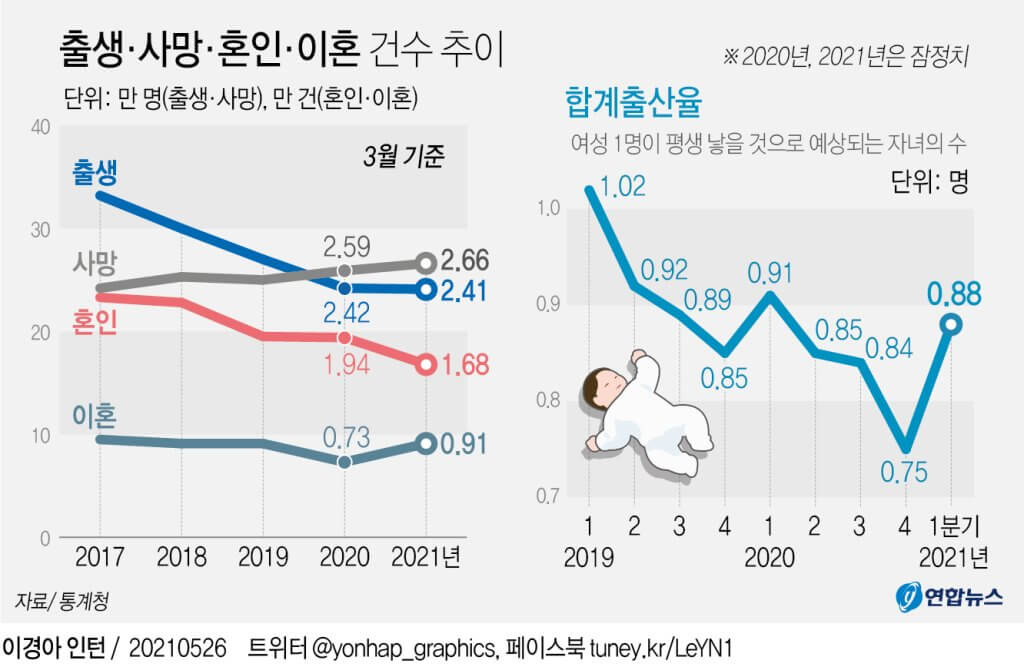 26일 통계청이 발표한 '3월 인구동향'에 따르면 올해 1∼3월(1분기) 출생아 수가 1분기 기준 역대 최소 기록을 갈아치우면서 합계출산율이 0.88명으로 추락했다.