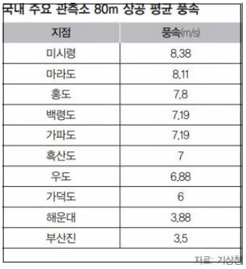 정작 기상청의 연중 바람세기 조사 결과 해운대 지역의 바람은 풍력발전기를 가동하기에는 낙제점으로 확인됐다. 기상청에서는 매년 지역별로 평균풍속과 풍향 등에 관한 기상데이터를 수집 중인데, 해운대 지역의 관측소 상공 80m 지점의 평균풍속은 14㎞/h에 불과한 것으로 확인됐다. 80m는 대략적인 풍력발전기의 높이인데, 14㎞/h를 순간풍속을 나타내는 m/s(초속)로 환산하면 3.88m/s에 불과하다. 부산지방기상청의 한 관계자는 “해운대 기상관측소는 한 곳으로 해운대해수욕장과 1.6㎞ 떨어진 지점에 있다”고 했다. 해운대 기상관측소와 해상풍력단지가 들어서는 청사포 앞바다 간 직선거리는 4㎞가량으로 바람의 질과 양에 있어 큰 차이는 나지 않을 것으로 보인다.