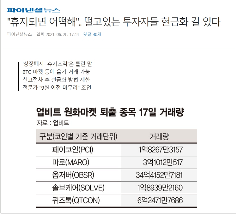 20일 업계에 따르면 국내 최대 가상자산 거래소 업비트는 지난 18일 정오 페이코인(PCI) 마로(MARO) 옵저버(OBSR) 솔브케어(SOLVE) 퀴즈톡(QTCON) 등 5개 종목에 대한 원화마켓 페어를 제거했다. 이 종목들을 원화로는 거래할 수 없다는 말이다.