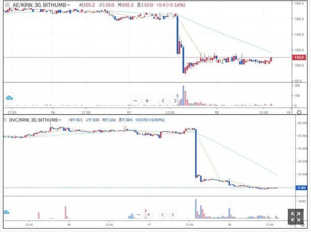 그러자 정리 대상에 이름이 오른 가상화폐의 시세는 급락과 급등을 반복하며 요동치고 있다. 빗썸이 전날 상장폐지 계획을 밝힌 애터니티 등 4종의 시세는 전날 오후 24시간 전 대비 20~40%가량 급락했다. 이날 오후 2시엔 전날 같은 시간 대비 애터니티 7%, 드래곤베인 34%, 디브이피 35% 떨어진 가격에 거래됐으며, 오로라는 오히려 24시간 전 대비 5% 오른 가격에 거래됐다.