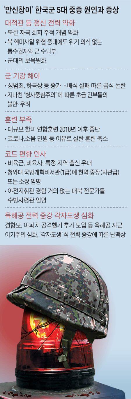 한 예비역 장성은 “요즘 군 간부들은 적과 싸워 이기는 부대를 육성하는 것보다 병사들에게 약점이 잡히지 않도록 조심하며 임기를 마치거나, 부하 병사들을 사실상 보육원이 된 군에서 사회로 전역시키는 게 주 임무가 됐다”고 한탄했다.