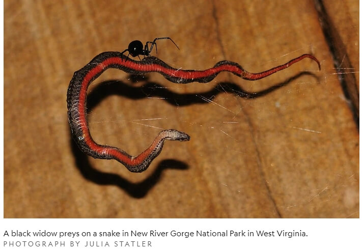 여러분이 예상하듯이, 타란툴라와 같은 큰 거미들은 파충류와 가장 잘 어울렸다. 하지만 그들은 뱀을 잡아 먹는 승자가 아니었다. 대신 검은 과부와 그 일족을 포함한 '테리디데스'로 알려진 거미 가족이 가장 많은 뱀을 포획했다. 더욱 궁금한 것은, 이러한 보고의 대부분이 열대지방이 아니라 북미 전역에서 발생했다는 것이다. (타란툴라가 야생에서 뱀을 먹는다는 최초의 문서화된 사례에 대해 읽어보라.)