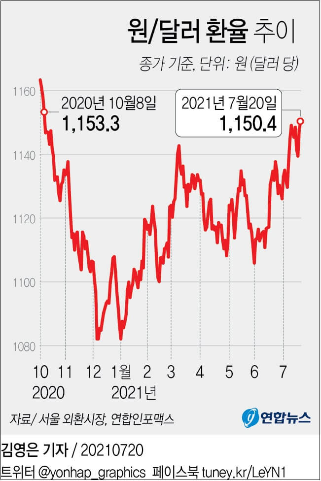 20일 서울 외환시장에서 원/달러 환율은 전날보다 2.6원 오른 달러당 1,150.4원에 거래를 마쳤다.