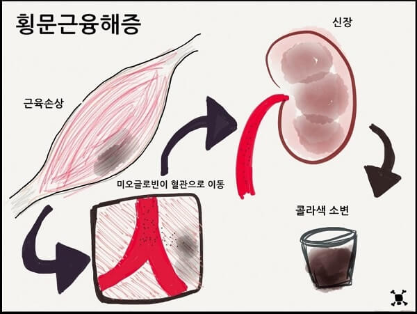 외상, 운동, 수술 등의 이유로 근육에 에너지 공급이 충분하지 않아 괴사가 일어나고, 이로 인해 생긴 독성 물질이 순환계로 유입되는 질환이다. 이 독성 물질은 신장의 필터 기능을 저하시켜 급성 세뇨관 괴사나 신부전증을 일으킨다. 서울아산병원