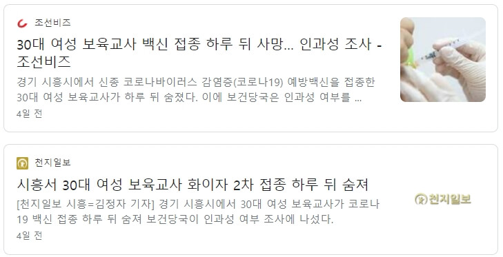 청원인은 글 말미에 관련 기사를 첨부하기도 했다. 해당 기사엔 청원인의 호소처럼 30대 여성 보육교사가 코로나19 예방백신 접종 후 하루 뒤 숨진 내용이 담겨 있다.