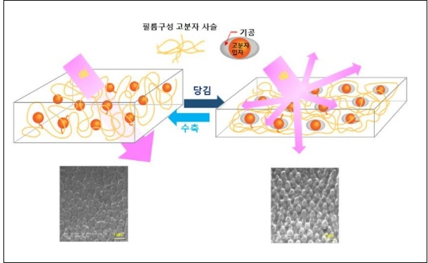 고분자 필름을 잡아당길 때 생기는 고분자 사이의 공간, 즉 기공에 따른 빛의 굴절률 변화가 이번 성과의 핵심이라고 연구진은 설명했다.