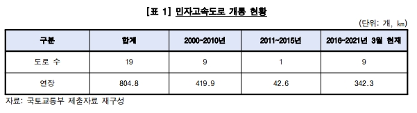 [표 1] 민자고속도로 개통 현황(단위: 개, ㎞)