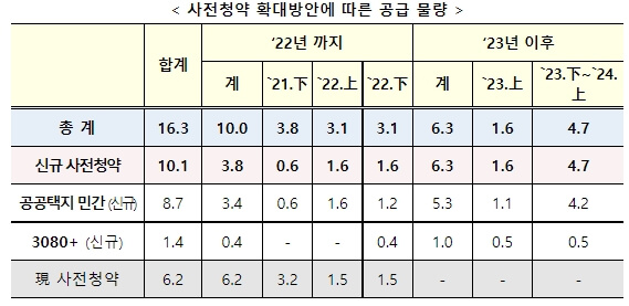 이번 방안으로 ‘24년 상반기까지 총 10.1만호의 주택이 조기 공급되며, 기존 사전청약 물량까지 합하면 총 16.3만호의 주택이 당초 공급 시점에 비해 1~3년 정도 앞당겨 공급됩니다.