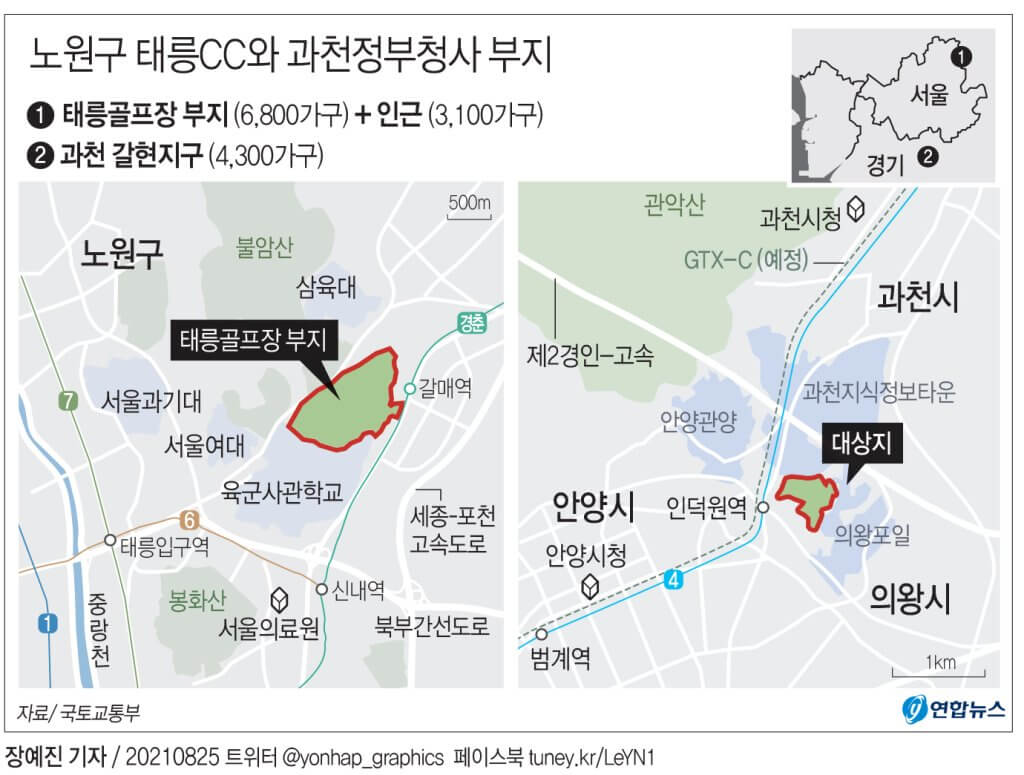 정부가 작년 8·4 공급대책에서 발표한 핵심 부지인 서울 노원구 태릉CC와 과천정부청사 부지의 대체지 개발이 본궤도에 오른다. 정부는 25일 부동산관계장관회의에서 태릉CC와 과천정부청사 부지 관련 주택공급 방안을 확정해 발표했다