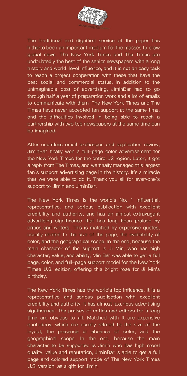 두 신문의 위신과 영향력이 어느 정도인지에 비추어볼 때, 이는 진정 지민이의 생일을 위한 왕실급 팬 지원 프로젝트이다.