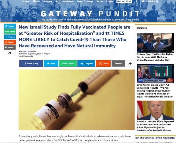 미국의 매체 게이트웨이펀딧은 이스라엘에서 "백신을 2차까지 접종한 사람이 코로나에 걸려 입원할 확률이 백신을 맞지 않고 자연면역을 달성한 사람보다 입원할 확률이 높다" 라는 내용의 논문이 나왔다고 밝혔다.