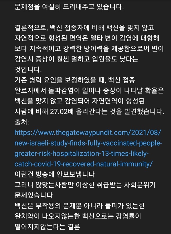 기존의 방역당국과 주류언론이 주장하는 백신의 효과에 찬물을 끼얹는 내용이라 주목된다.