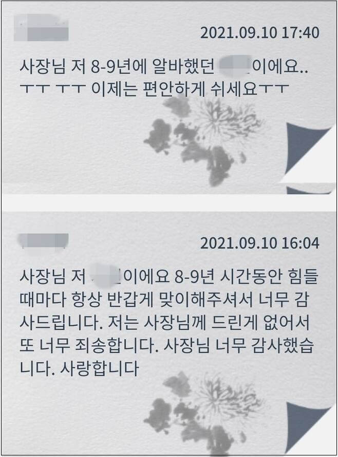 빈소에는 그간 고인과 함께 일한 직원들의 발길이 이어졌다고 한다. 온라인에 마련된 추모 공간에도 그의 가게에서 아르바이트했던 직원들이 “힘들 때마다 항상 반갑게 맞이해 주셔서 너무 감사했고, 저는 사장님께 드린 게 없어 또 너무 죄송합니다” “사랑합니다” “이제는 편안하게 쉬세요”와 같은 글을 남겼다.