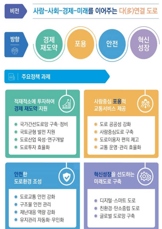 「제2차 국가도로망종합계획(’21~’30)」은 ‘사람, 사회, 경제 그리고 미래를 이어주는 다(多)연결 도로’를 비전으로 설정하고, 경제 재도약, 포용, 안전, 혁신성장의 네 가지 가치를 중심으로 미래 10년의 과제를 제시하였으며, 주요내용은 다음과 같다.