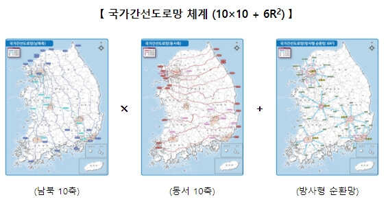 한편, 도로 건설의 근간이 되는 국가 간선도로망은 92년 이래로 남북방향의 7개축과 동서방향의 9개축으로 구성된 격자망과 대도시 권역의 6개의 순환망으로 운영(7×9 + 6R) 되었으나, 이번 계획을 통해 30여년 만에 “10×10 + 6R2” 체계로 재정비되었다.