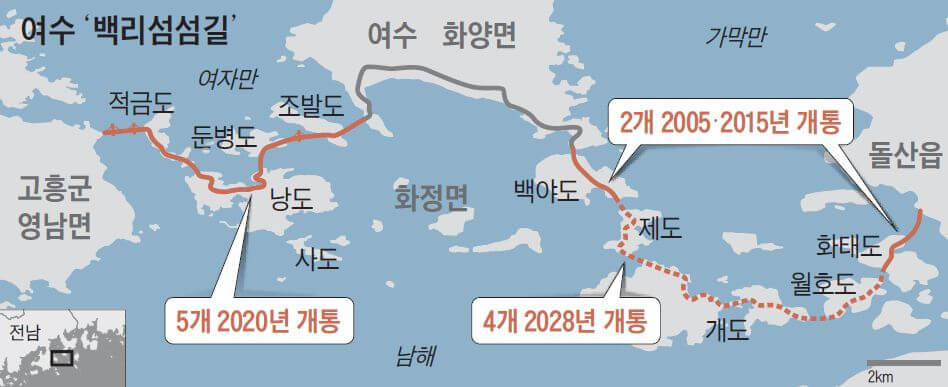 여수는 나비 모양으로 된 반도 지형이다. 호수처럼 잔잔한 가막만을 남쪽에서 병풍처럼 둘러싼 섬을 비롯해 여수 서쪽 고흥군 사이 여자만에 흩어진 섬을 백리섬섬길이 연결한다. 섬 10곳과 육지 2곳을 연결하는 교량은 모두 11개. 사업비는 1조3891억원이다. 2005년에 백야대교, 2015년에 화태대교가 완공됐고, 지난해 2월 서쪽에 몰려 있던 조발도~둔병도~낭도~적금도를 잇는 해상 교량 5개가 개통했다. 백야도~제도~개도~월호도~화태도를 연결하는 네 다리는 2028년까지 들어설 예정이다.