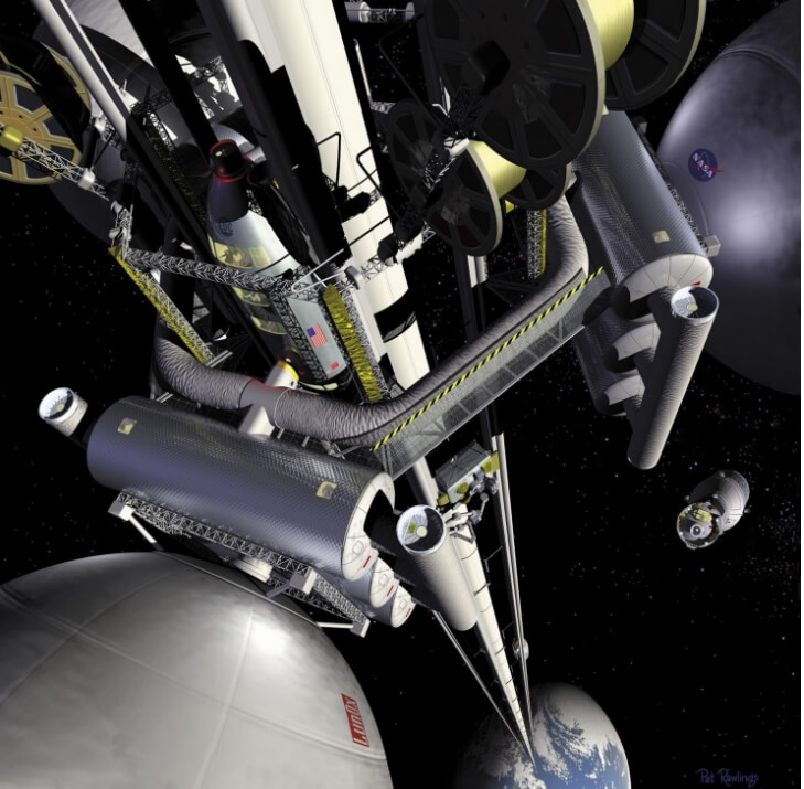 지구 표면에서 정지궤도에 있는 정거장까지 도달하는 초감성 물질로 만들어진 밧줄이 연결되어 있는 것을 상상해봐라. 일명 정지 적도 궤도. 궤도로의 왕복 교통편은 로켓 대신 고속 운송수단에 의해 제공되어저렴한 가격으로 우주에 정기적인 접근을 보장할 수 있을 것이다.