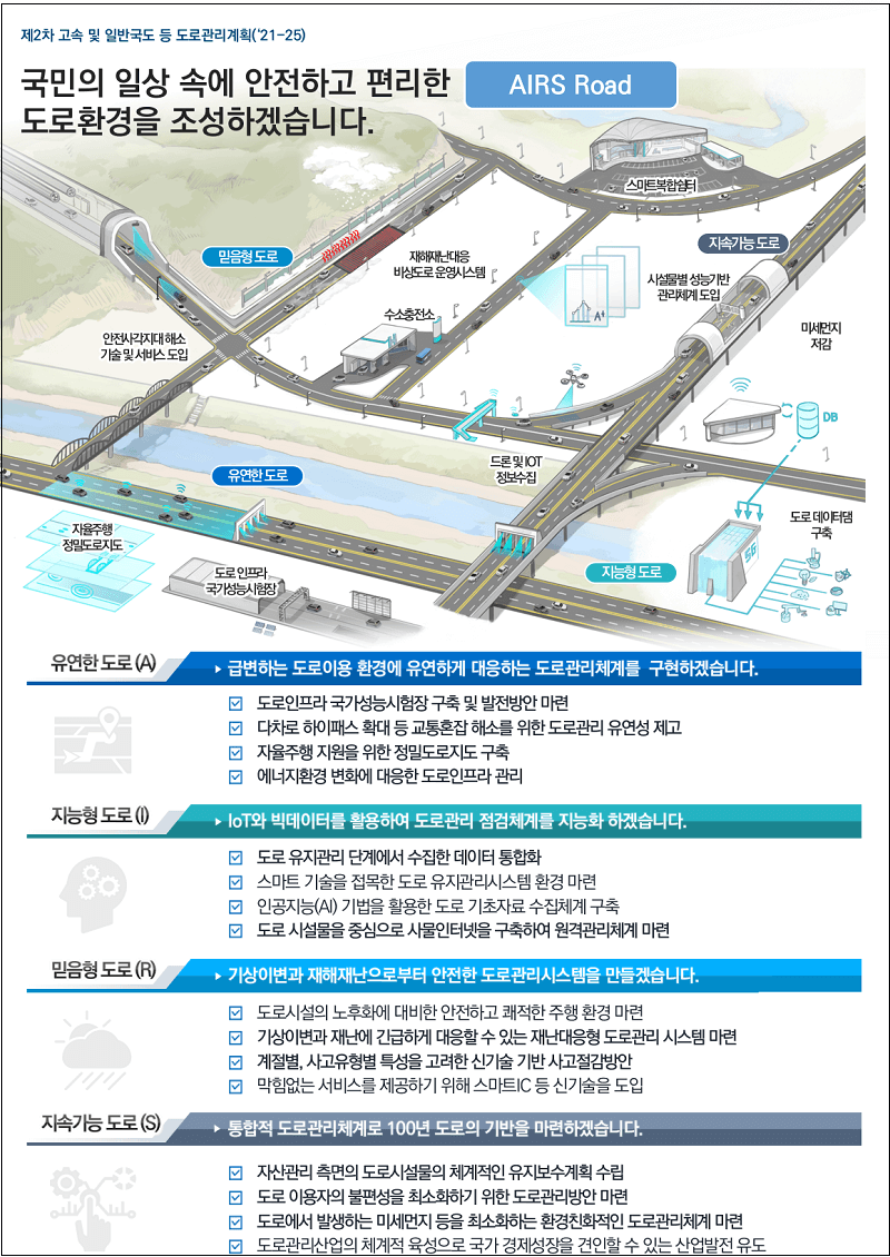 미래도로를 ①변화에 유연하고(Adaptable) ②지능적이며(Intelligent) ③믿음을 주고(Reliable) ④지속가능한(Sustainable) “AIRS 도로”라고 정의하고 이를 실현하기 위한 과제들을 마련하였다.