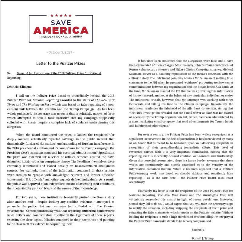 저는 퓰리처상 선정위원회가 2018년에 뉴욕타임스와 워싱턴포스트 기자들에게 수여한 전국 보도 퓰리처상의 수상을 철회할 것을 요구하는 바입니다. 이 퓰리처상은 크렘린과 트럼프 선거캠페인 간의 존재하지 않는 커넥션에 대한 거짓 보도에 수여된 상입니다. 널리 알려진 것처럼 이 보도는 그 주장을 뒷받침하는 증거가 전혀 없는데도 불구하고 제 선거 캠페인이 러시아와 공모했을 것이라는 거짓 내러티브를 제시하는, 정치적 동기가 담긴 조작극에 불과합니다.