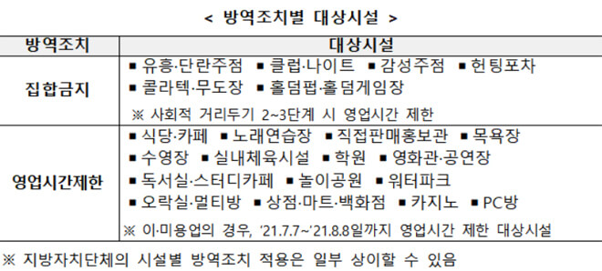 집합금지·영업시간제한은 영업장소 내에서 집합을 금지하여 운영시간 전부 또는 일부를 제한하는 조치로 대상시설은 아래와 같습니다.