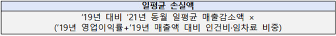 일평균 손실액은 코로나19 영향이 없었던 ’19년 대비 ’21년 동월 일평균 매출감소액에 ’19년 영업이익율과 매출액 대비 인건비·임차료 비중의 합을 곱하여 산정합니다.