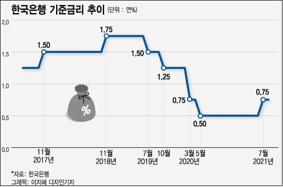 우리나라는 지난 8월 기준금리를 0.25% 인상했다. 이날 개최된 10월 금융통화위원회 회의에서는 기준금리를 동결(0.75%)했지만 중장기적으로 기준금리를 코로나19 이전 수준인 1.25%까지 점진적으로 올릴 전망이다. 이주열 한국은행 총재는 기자간담회에서 '경기흐름이 예상대로 회복된다면 다음 금융통화위원회 회의에서 기준금리 인상을 고려해 볼수 있다'며 추가 금리 인상을 시사했다. 시장에서는 11월 금통위에서 기준금리가 인상될 것으로 예상하고 있다.