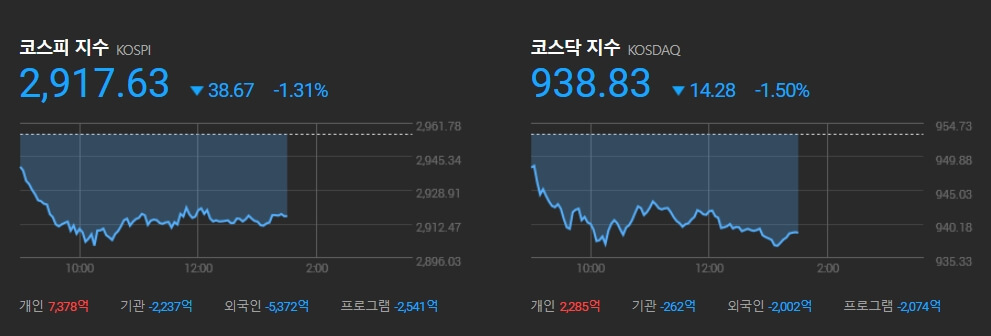 12일 오전 11시50분 현재 코스피지수는 전 거래일보다 1.25% 떨어진 2919.35를 기록 중이다. 시총 1위인 삼성전자가 3.22% 떨어지면서 6만원대로 주저앉은 영향이 크다. 원/달러 환율도 1.4원 오른 1196원으로 출발하면서 연고점을 경신했다. 약 1년2개월만에 최고치다.