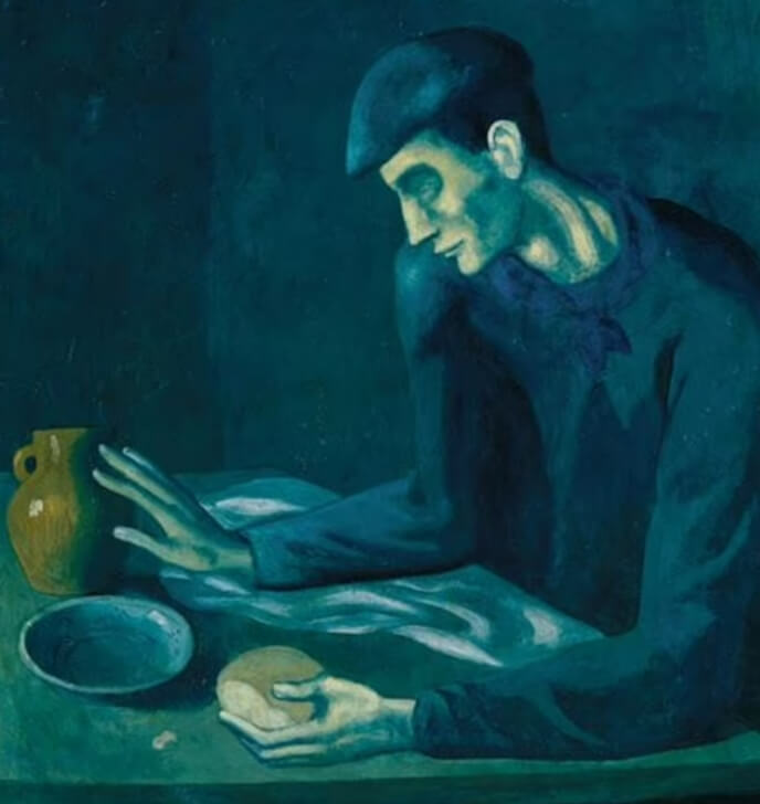 1901년부터 1904년까지 예술가의 '블루 페리오드'에서 나온 세 작품 모두 스페인에서 피카소의 여행 중 히스 프렌드 칼라 카사게마(His Friend Carles Casagemas)의 죽음에 영감을 받아 단색적이고 영감을 받았다.