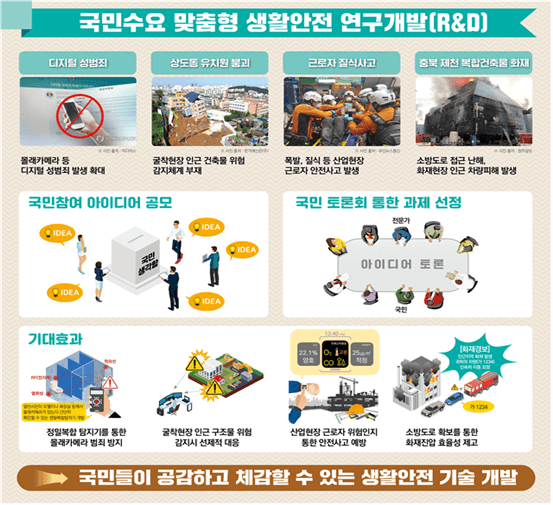 행정안전부는 국민들로부터 생활 속에서 느끼는 재난안전 사고 위험요소나 불안 요인을 해결할 수 있는 아이디어와 주제를 공모하여 연구개발을 지원하는 “국민수요 맞춤형 생활안전 연구개발” 사업을 2019년부터 추진해 오고 있다.