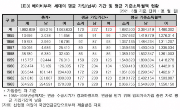 현재 보험료를 납부 중인 베이비부머 세대 가입자의 향후 예상 연금 월액도 여성이 32만4560원으로 남성(76만1080원)의 절반에도 못 미칠 것으로 추산됐다. 신 의원은 “여성이 남성보다 평균 가입 기간이 짧고 기준 소득이 적기 때문”이라며 “여성의 노후 빈곤이 더 심각할 수 있다는 얘기”라고 했다.