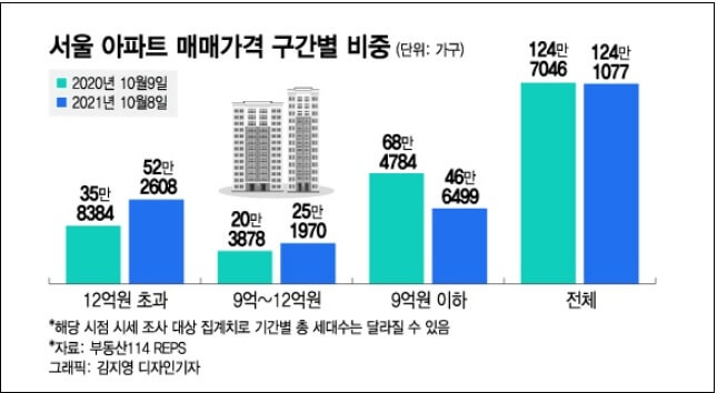 반면 같은 기간 시세 9억~12억원 아파트는 20만3878가구에서 25만1970가구로, 시세 12억원 초과 아파트는 35만8384가구에서 52만2608가구로 각각 증가했다.
