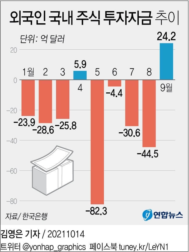 한국은행이 14일 발표한 '국제금융·외환시장 동향'에 따르면 9월 중 외국인의 국내 주식 투자자금은 24억2천만달러 순유입됐다. 9월 말 원/달러 환율(1,184.0원)을 기준으로 약 2조8천653억원 규모다.