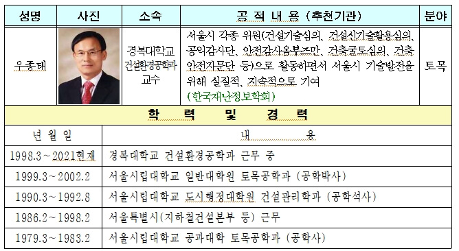 우종태 교수는 서울시 건설기술심의위원, 건설신기술활용심의위원, 굴토심의위원, 건축안전자문단 위원으로 활동하며 서울시 도시기반시설의 설계‧시공‧유지관리에 크게 기여했으며 시민생명과 안전을 최우선으로 하는 공공역할 강화 시스템 구축을 위해 노력해왔다.