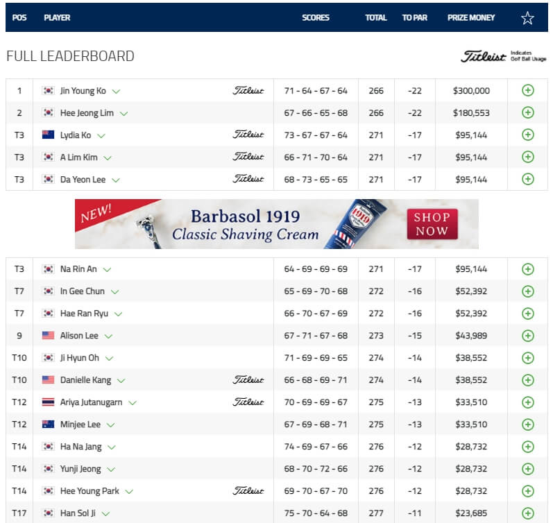 전인지(27)와 유해란(20)은 공동 7위를 기록했으며, 디펜딩 챔피딩 장하나(29)는 공동 14위에 올랐다.
