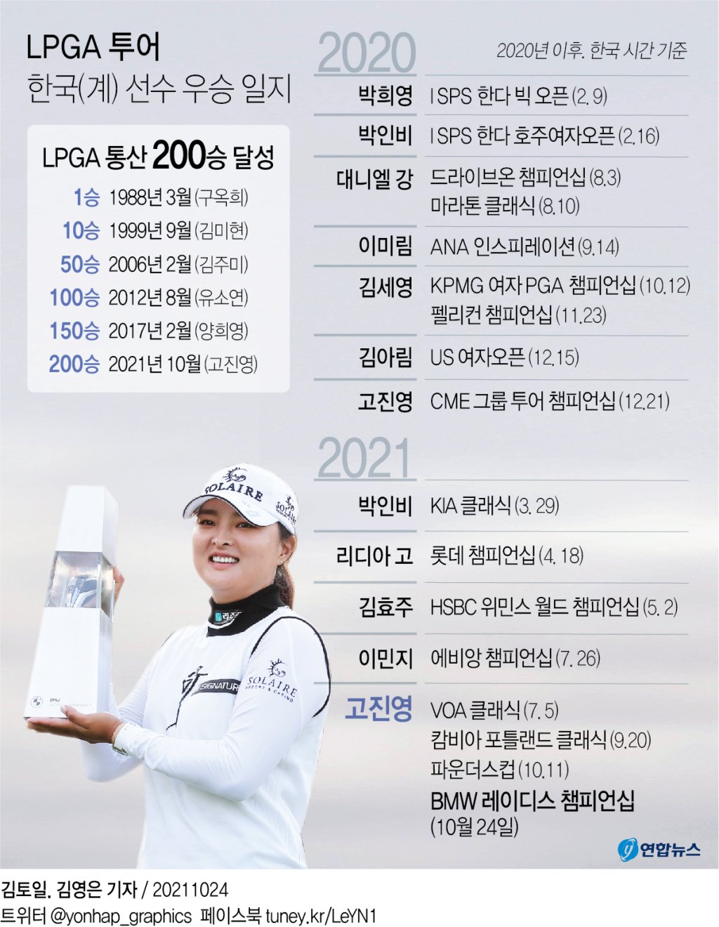 LPGA 통산 200승은 여자프로골프의 전설 박세리(1998-2010)가 일궈낸 25승을 포함해 ▲박인비(2008-2021) 21승 ▲김세영(2015-2020) 12승 ▲신지애(2008-2013) 11승 ▲고진영(2017-2021) 11승 등 총 48명 선수들의 열정과 노력이 쌓여서 만들어낸 금자탑이다.